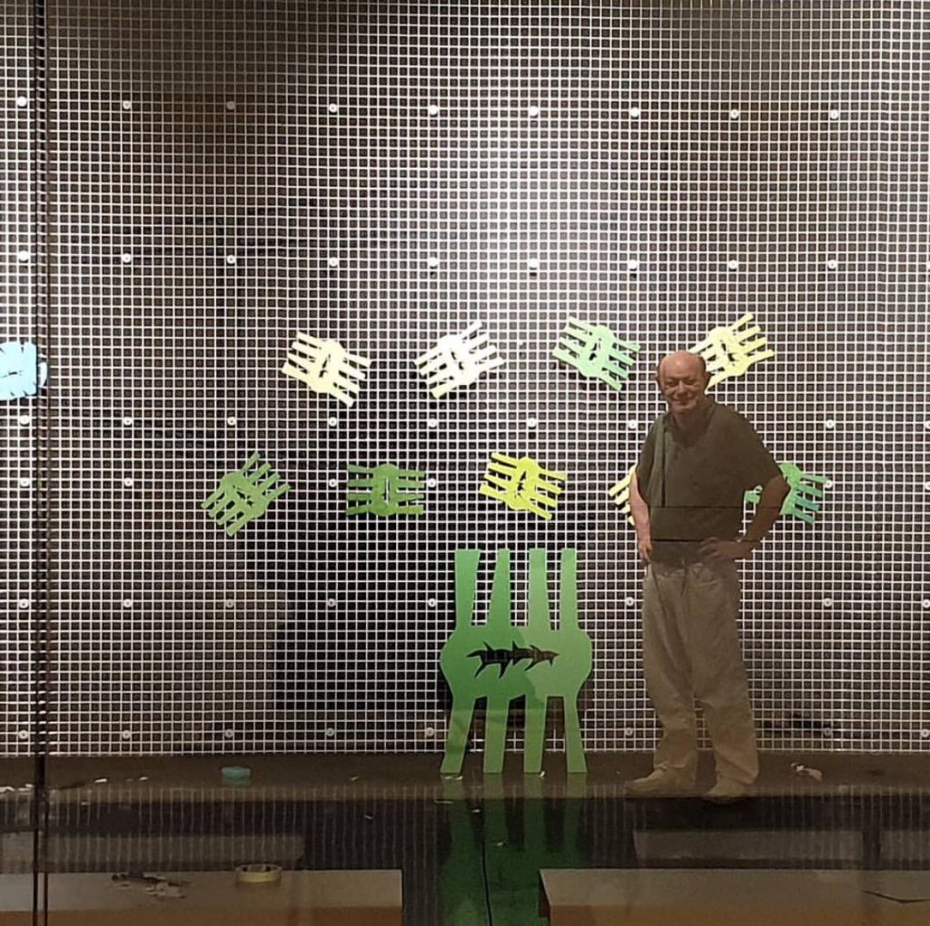 Dopo la realizzazione del Giardino al Macro nel 2019, avevo già progettato la realizzazione di un Palude, pensavo di rappresentare l’altra faccia della vita e ridipingerla come una palude con toni grigi dominanti  e verdi scuri. In sede esecutiva non ci sono riuscito. Quando ho cominciato a realizzare i 5 prototipi in cartoncino 70 100,dipinti con degli spry, da rifare poi in formato più grande 4 metri x 4,  tagliati nei nuovi materiali da un artigiano che fa insegne al neon, l’idea del colore grigio e stata abbandonata, e sono rientrato sui colori vivi, celesti, azzurri, verdi vivi per rappresentare un lago. Le 5 opere formato 4metri x 4 dovrebbero essere sistemate a terra in una sala grande a rappresentare proprio un lago o un mare. Questo e un ultimo lavoro che continua l’istallazione fatta al Macro, e può essere variato a seconda dello spazio espositivo. Anche per i materiali,  ci sono varie possibilità di scelta, oltre il legno laccato, si possono usare poliuretani e cartone pressato. Ho presentato questo progetto al concorso del Mibact Cantica 21.