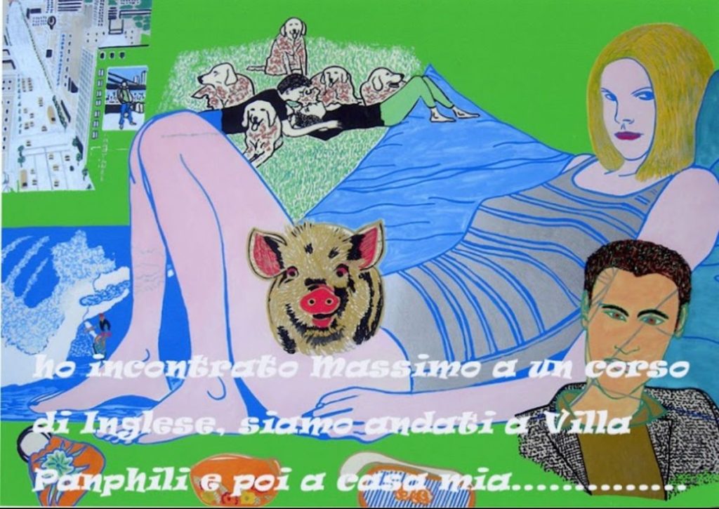 Nell’ opera Desideri per esempio ho costruito un semplice racconto, anzichè riempire l’opera di immagini che si sovrappongono a caso, ne scelgo alcune che spesso si sistemano da sole. E chiaro, che sono, foto di viaggi fatti, amici del personaggio ritratto, oggetti, giardini, sculture, bambini, e divani, che definiscono la scena. Alla fine guardandolo per lo meno si puo dire che il personaggio sogna o pensa a qualcosa, al contrario di molti altri personaggi di artisti famosi che sembrano non fare assolutamente niente, sospesi nel vuoto della vita.